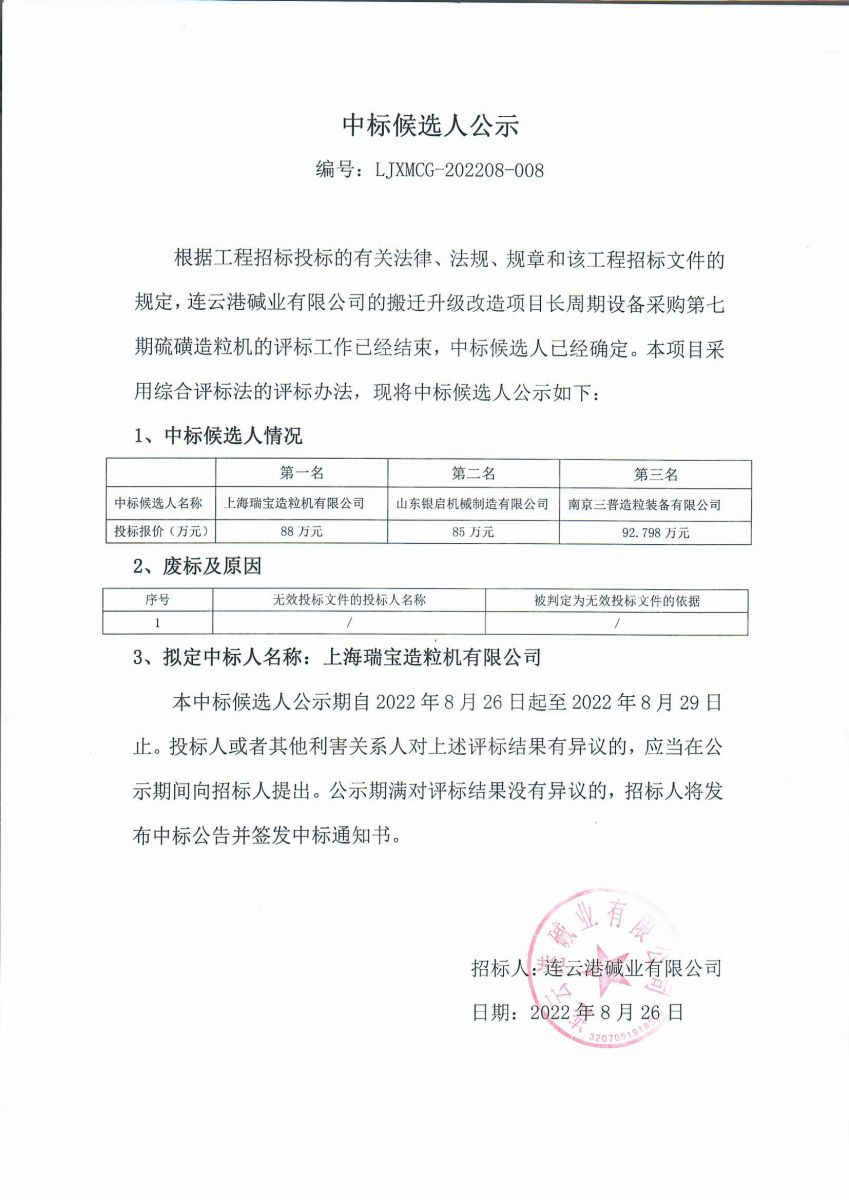 搬遷升級(jí)改造項(xiàng)目硫磺造粒機(jī)中標(biāo)候選人公示