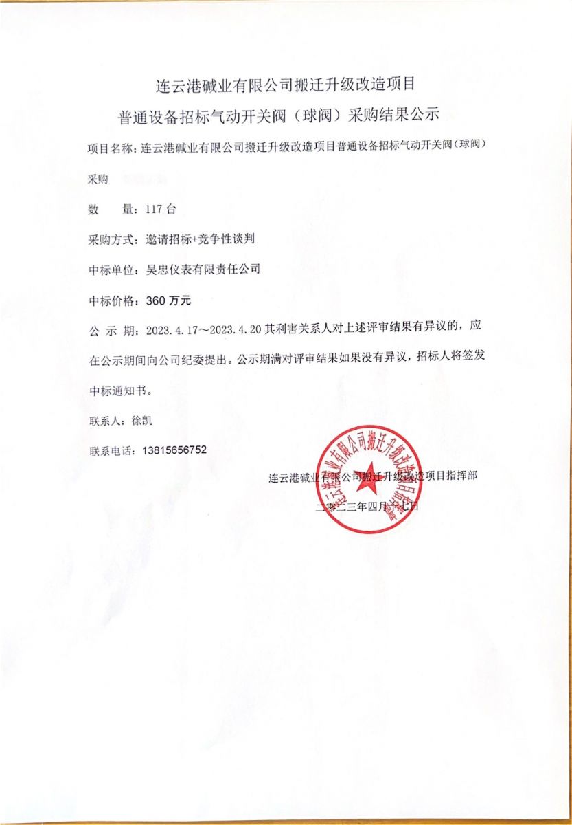氣動開關閥(球閥)采購結(jié)果公示